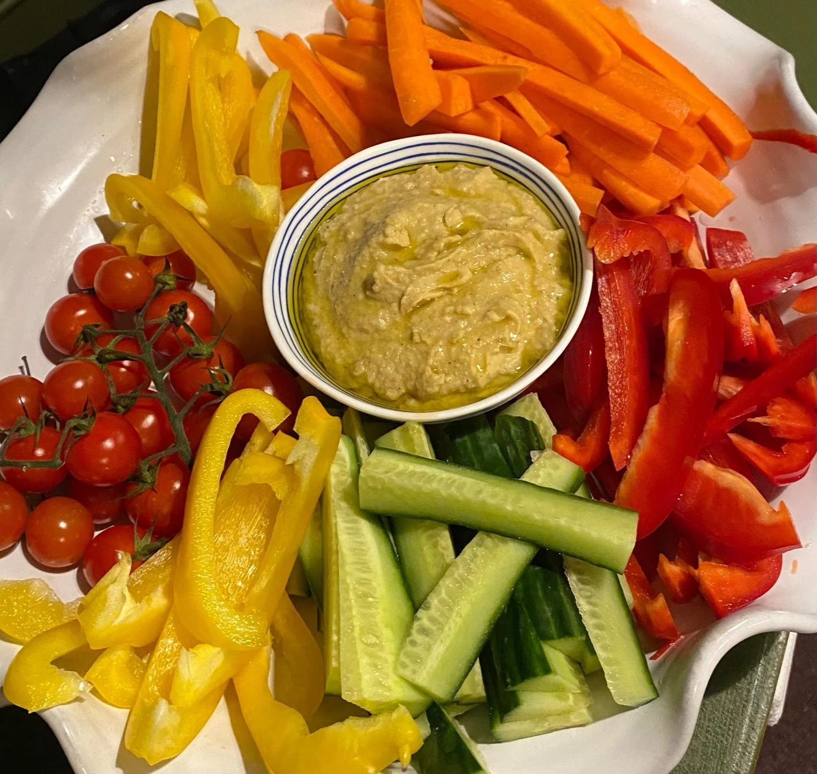 Spoon the hummus into a bowl and place it in the centre of a large plate.