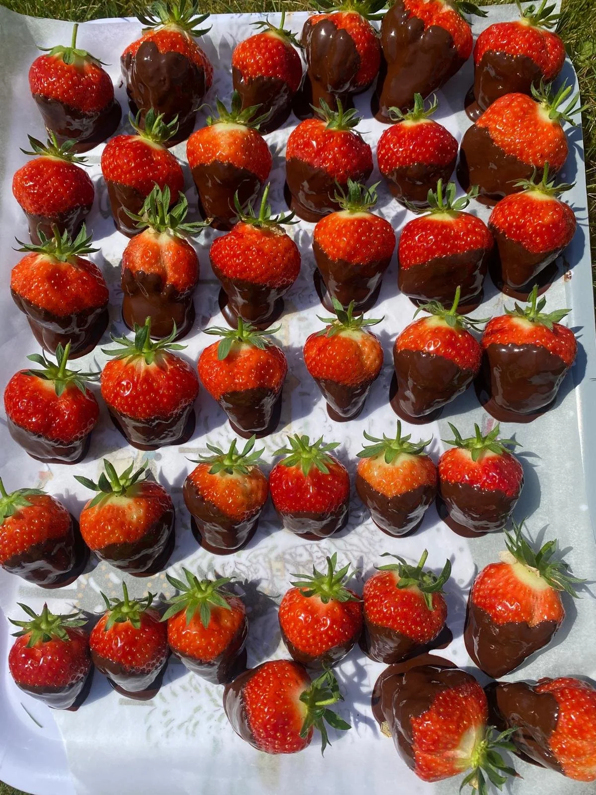 Hold each strawberry by the green top and dip it into the melted chocolate, swirling to coat.